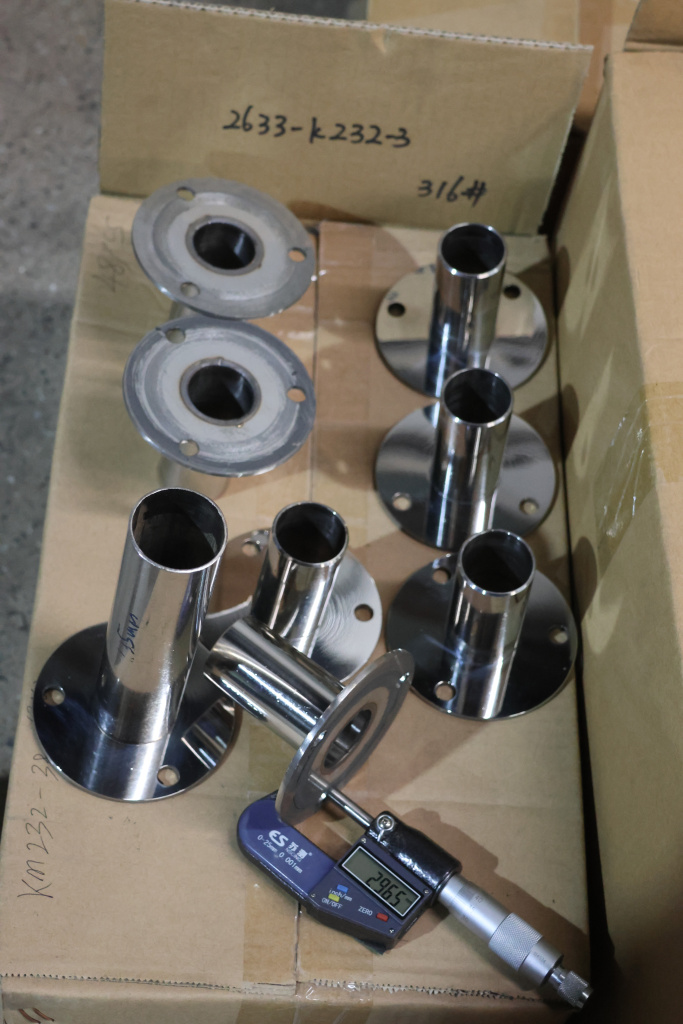 Треханкерная закладная для трубы диметром 38.1х1.5 мм, на деревянную ступень, фланец 3 мм. Деталь полированная, самосборная, с тремя отверстиями. Марка стали - AISI 316