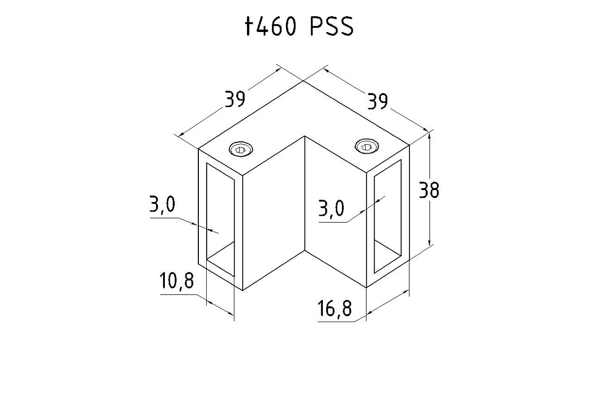 Предназначен для соединения штанг в душевых кабинах, позволяя соединить их без сварки. Высота соединителя равна 38 мм. Длина каждой из двух сторон составляет 51 мм, ширина 16 мм. Габаритные размеры прямоугольной стенки составляют 30х10 мм. Идеально сочетается с прямоугольным треком t440 PSS и t440 SSS.