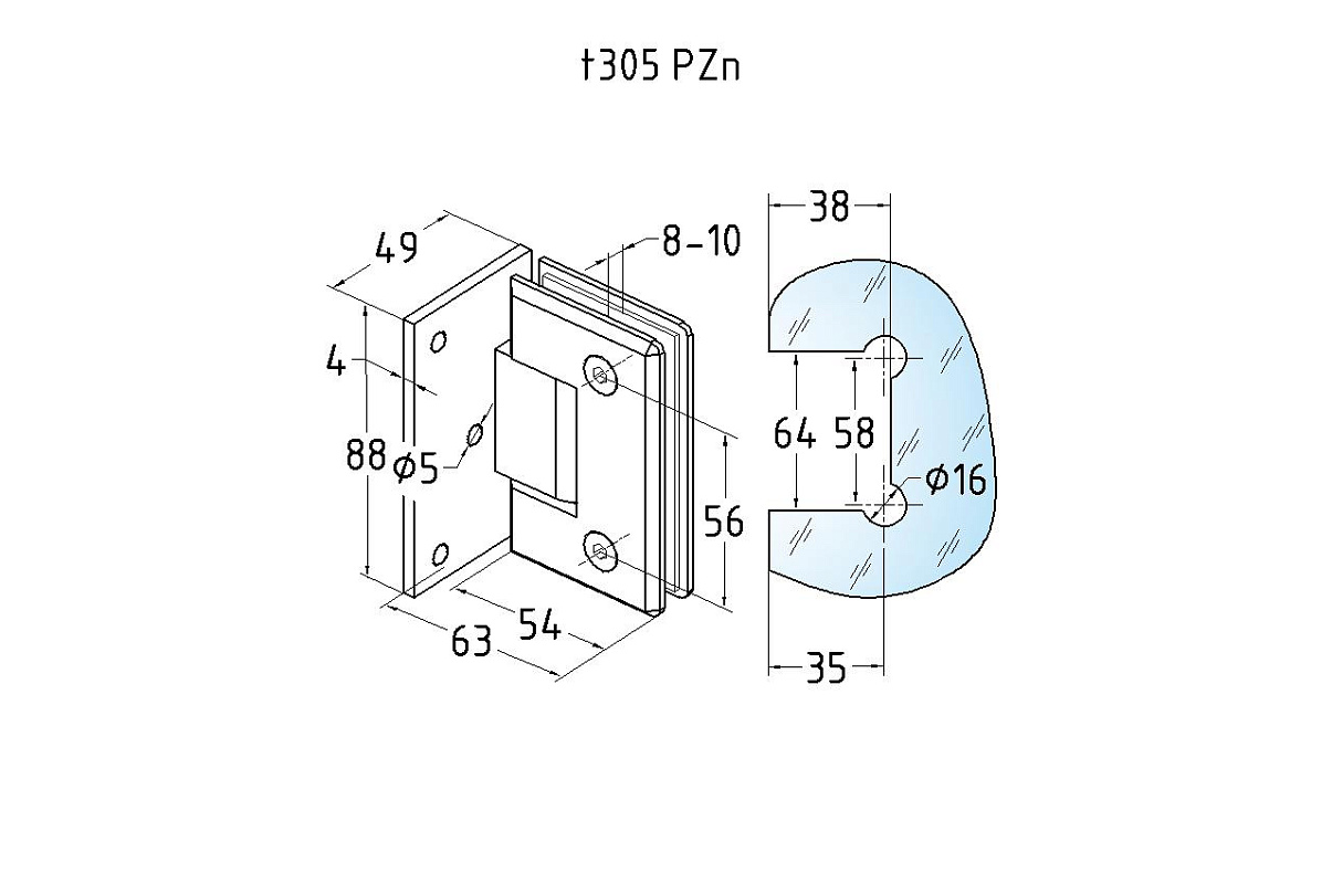 Петля для душевой кабины стена-стекло 90° с односторонним креплением, 90*55, цинк, полированная t305 PZn