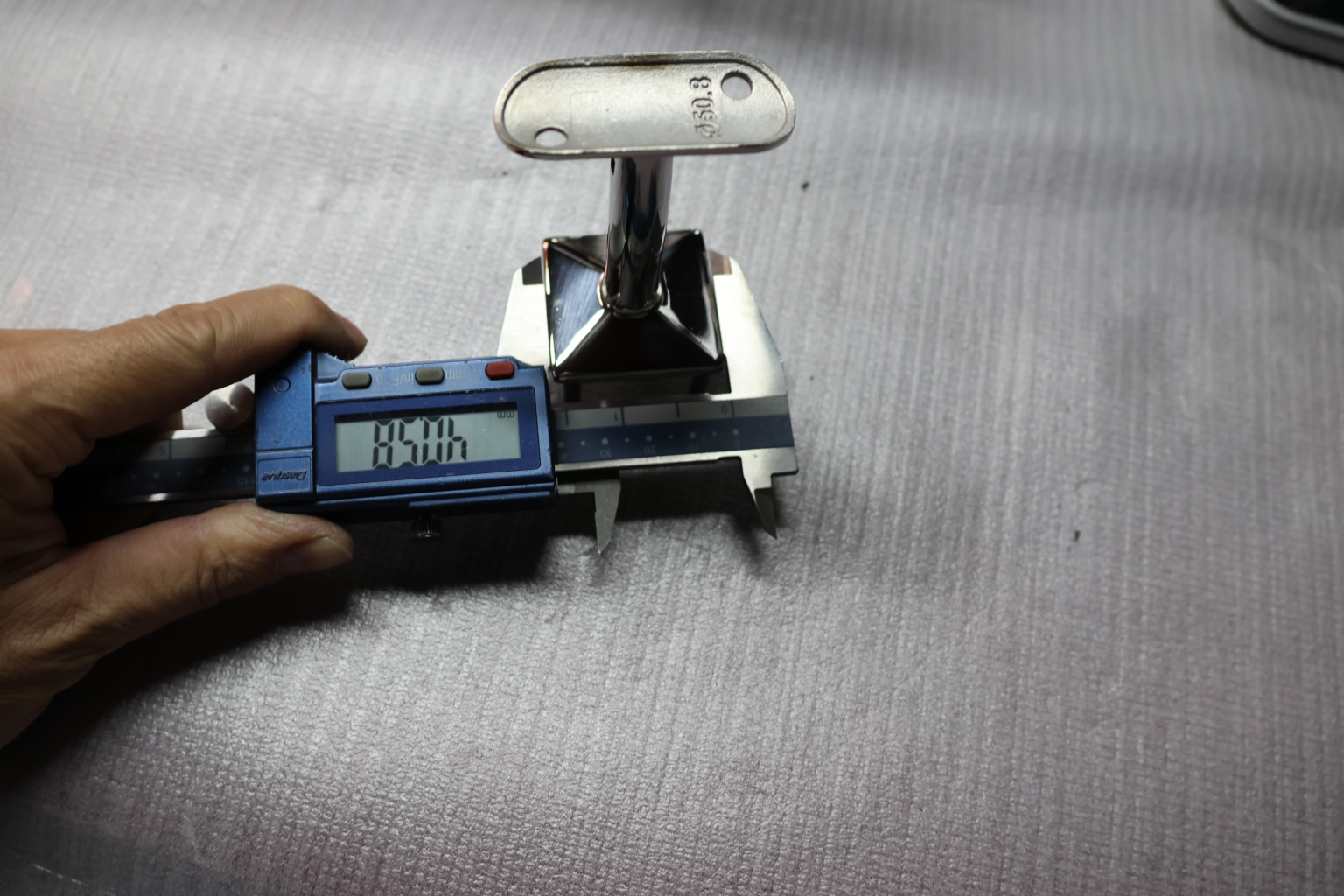 Наконечник палец на стойку из профильной трубы 40х40 мм, с регулируемым ложементом под поручень Ø50.8 мм, полированный, литой, облегченный нержавеющий AISI 304 k239-3