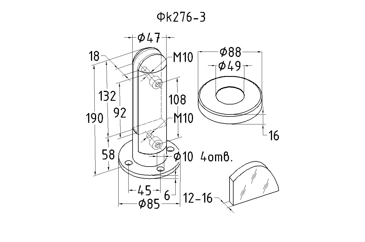 Держатель крепится в пол на 4 анкера или шпильки. Для этого предусмотрено 4 отверстия диаметром 10-12 мм. Стекло зажимается в стеклодержатели с помощью двух фиксирующих винтов, количество уплотнителей варьируется. В зависимости от толщины стекла может потребоваться дополнительный винт. Высота ограждения должна быть не более 1200 мм от пола. Если по проекту предусмотрен поручень, то мы рекомендуем использовать трубу с пазом прямоугольного сечения 60х40 (k824-4, k824-2, k824-5 ) или круглого сечения ф48( k822-3) и ф42 (k820-3