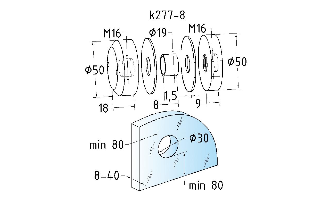 Точечный стеклодержатель для торцевого крепления несущего стекла в широчайшем диапазоне от 8 (4+4) мм до 40 (20+20) мм. Диаметр наружной (хрюшка) и внутренней шайб по 50 мм.