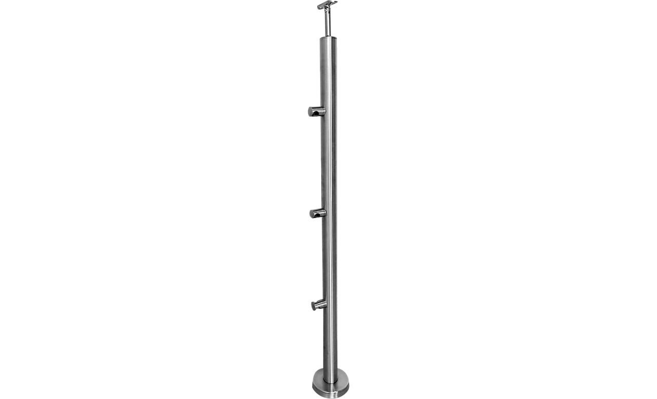Стойка изготовлена на нашем производстве и готова к установке сразу после покупки. Используемая при изготовлении 304 марка стали позволяет применять данную стойку как внутри здания, так и на улице. Особенно это важно для людей, которым важно сделать свои ограждения в одном стиле как внутри здания, так и снаружи. Все элементы стойки приварены аргонной сваркой, благодаря чему фланец с 3-мя отверстиями для крепления в пол, ригеледержатели под трубу ф16мм и наконечник под трубу ф38-50 составляют единую конструкцию со стойкой. Сварные швы на балясине убраны и идеально заполированы,а балясина ничем не уступает ограждениям сделанным профессиональными бригадами. Любой человек сможет сделать монтаж имея только отвертку, клей( ф-1127, ф-1105) и саморезы( , , ) 3-хригельная балясина самая распространенная за счет сбалансированности дизайна, цены и обширного использования. Данную балясину используют во входной группе, на лестничных маршах общественных помещений и не редко ее применяют в частных домах, где ограничен бюджет, но нужно сделать устойчивое ограждение.