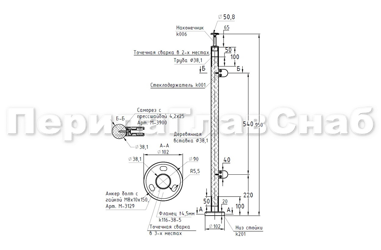 Готовая стойка Ø38,1 мм, с фланцем и наконечником, высота 950 мм, полированная (AISI 304) k702 купить в Самаре