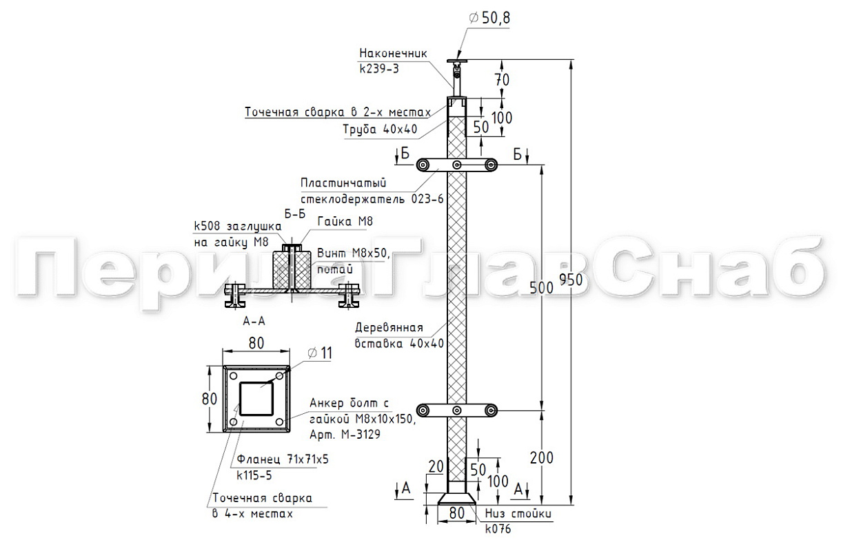 Готовые стойки – это экономия вашего времени и денег. Приобретая готовую стойку Вы можете собрать ограждение сами, не привлекая монтажную бригаду и экономя денежные средства на монтаже. Стойка легко монтируется к полу благодаря четыреханкернуму фланцу с отверстиями под анкер-болт М8 ( , , ) или шпильку ( ; ) в комплекте с хим анкером или , а крепеж скрывает декоративная крышка идущая в комплекте стойки. Поручень из нержавеющей стали можно закрепить при помощи самореза (, , ), либо при помощи заклепки () и винта М6 (М-3973) что на порядок эффективней, для крепления при помощи заклепок необходимо растачивать отверстие в ложементе. Если вы используете деревянный поручень, то его можно закрепить при помощи саморезов ( , , ). После покраски дубовой проставки подклеиваете клеем ( , ). Ограждение готово!