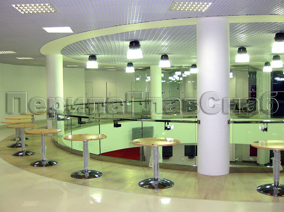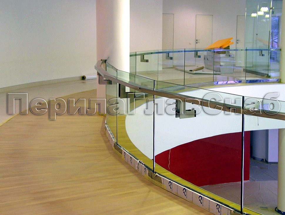 Ограждение со стеклом по кругу атриума.Оригинальный элемент совершенно уникальных для данного типа ограждений — поручень на выносных элементах установлен сбоку стекла.На заднем плане хорошо видны цельностеклянные офисные перегородки.