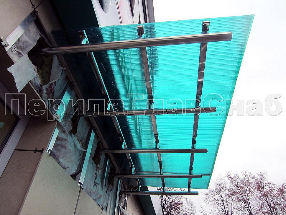 Над входом в здание банка был установлен козырек из нержавеющей стали каркасной части конструкции и цветного поликарбоната в качестве верхнего покрытия от компании «ПерилаГлавСнаб».