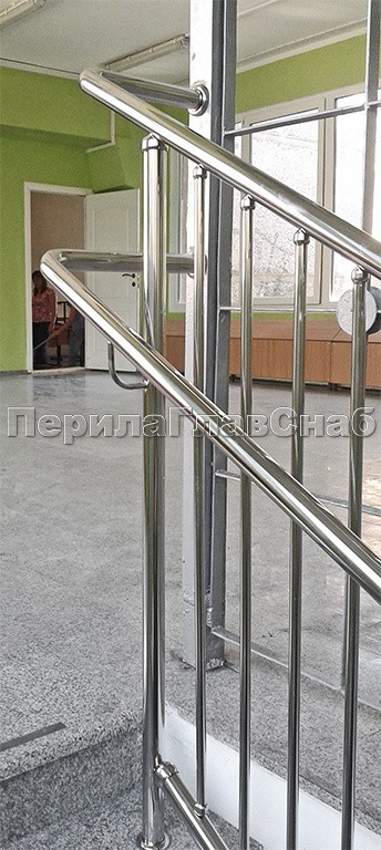Перила для прямой лестница с креплением нержавеющего поручня к стойкам через полусферические наконечники.