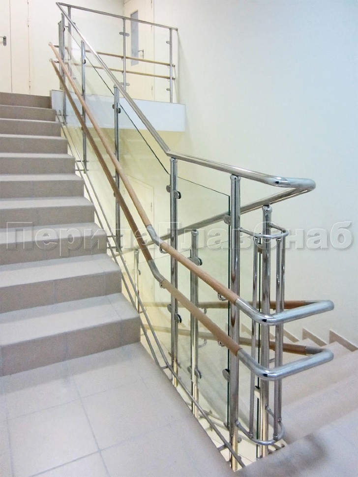 Ограждение со стеклом (на зажимных стеклодержателях) и стойками. Стойки установлены в торец ступеней. Поручни завязаны на поворотах.
