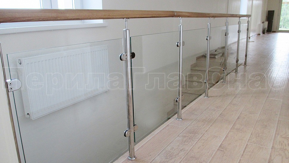 Клееный дубовый поручень, без тонировки покрытый лаком в один слой крепится над стойками. Окончание поручня заглушка из полированной нержавеющей стали. Поручень крепится к держателю поручня на саморезах с полукруглой головкой. Поручень завязан между маршами дубовыми отводами через нержавеющие кольца с круглыми проставками из дуба. Между маршами (на повороте 90 градусов) внахлест на стойки привариваются снизу по четыре ригеля – трубки из полированной нержавеющей стали с забивными заглушками.