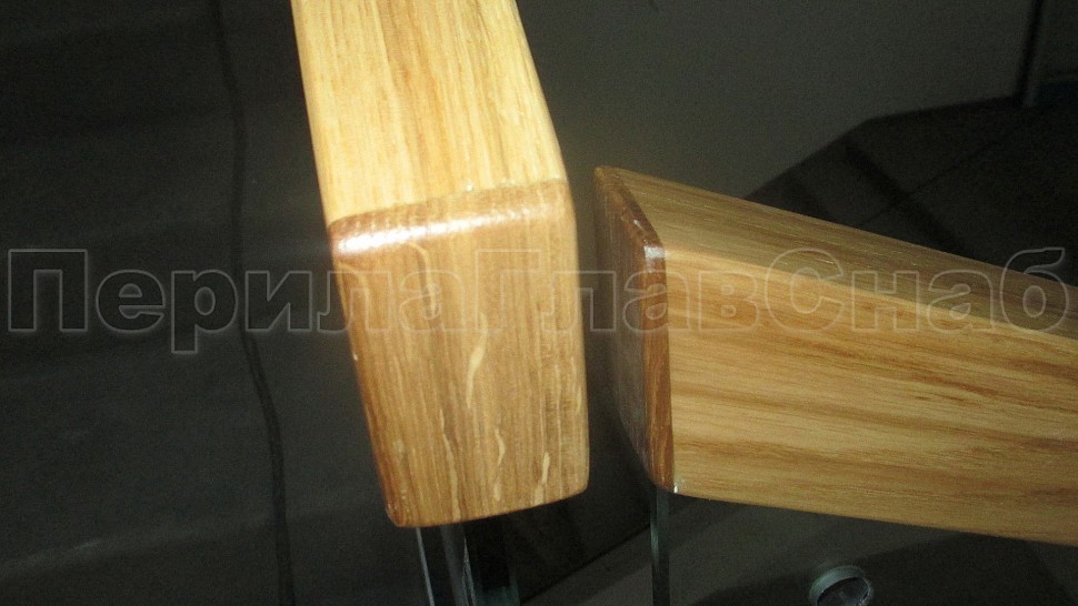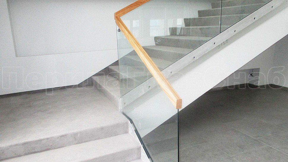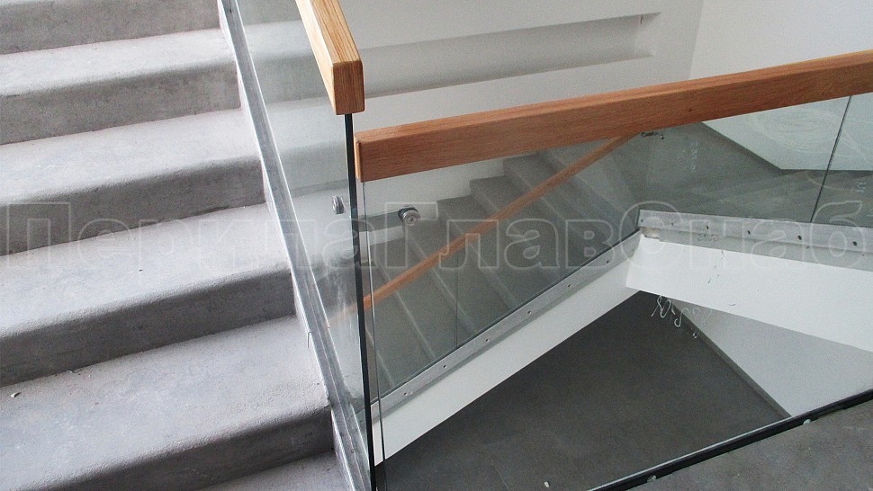 Лучшим решением в оформлении лестницы являются перила комбинированного вида. Такой заказ поступил к нам в компанию. Сочетание металла, дерева, стекла, которые обладают прекрасными декоративными свойствами. Они имеют высокую прочность и обеспечивают гармоничное вхождение в любой интерьер административного здания. Ограждение колодезной лестницы и площадок с прозрачным закаленным 10 мм стеклом и полировкой кромки по периметру с креплением в торец ступеней на нижнем зажимном алюминиевом профиле высотой 114 мм и шириной 44 мм. Высота ограждения с поручнем на стекле сверху 950 мм. Поручень дубовый клееный из сегментов сечением 40х60 мм с тонировкой в RAL и покрытый лаком. На поворотах поручень обрывается, между двух стекол в верхней части угловой соединитель из нержавеющей стали. На алюминиевый профиль с торца крепится накладка из полированной нержавеющей стали 1 мм.