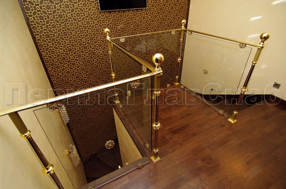 - Ограждение лестницы с прозрачным стеклом, стойками и поручнем из латуни